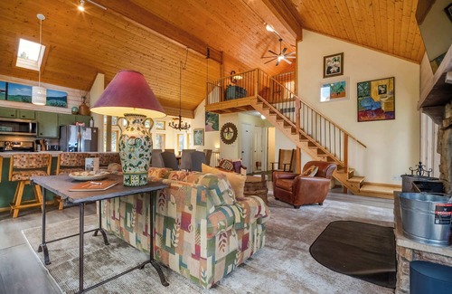 The high ceilings and open floor plan offer room for the whole family. Gather around the fireplace on chilly evenings or take in the views from the deck on warmer nights. The kitchen is equipped with new stainless steel appliances. Featuring a colorful array of wall art and fixtures, the dreamy main includes a cloudscape en suite complete with a luxurious soaking tub, spacious shower, and walk-in closet. The furnished loft space features a sunny rec room (with a sink and vanity), a cozy sitting area with a selection of books and games, and additional sleeping accommodations. High-speed WiFi allows you to connect with loved ones and share highlights during your amazing stay.