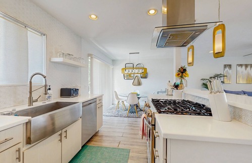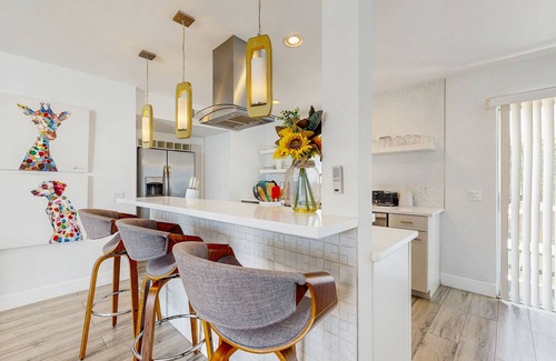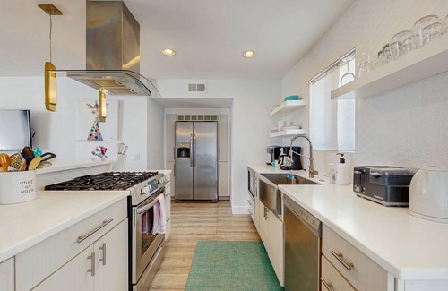 Inside, the spacious living room is made for relaxation—whether it’s movie night with cable TV, binge-watching Netflix, or just lounging after a day of adventures. The fully stocked kitchen has all the modern must-haves (fridge, stove, oven, dishwasher, coffee maker) so you can whip up anything from pancakes to poolside snacks. We’ve got you covered with fresh linens and towels, so you can travel light and worry-free.