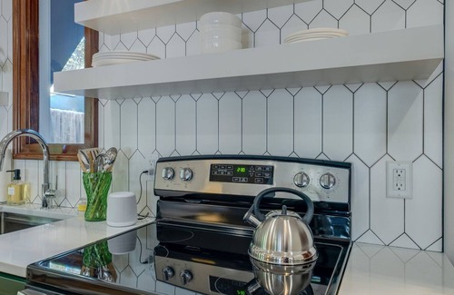 There are hardwood floors throughout as well as a full size oven/range, a full size refrigerator (with ice maker), a toaster, a single serve Keurig with a variety of K-cups, (tea, creamer, sugar, sweeteners) and a washer and dryer. There is a 50” smart TV featuring local TV broadcast stations and most of the popular streaming apps, however you will need to use your own streaming accounts/credentials.