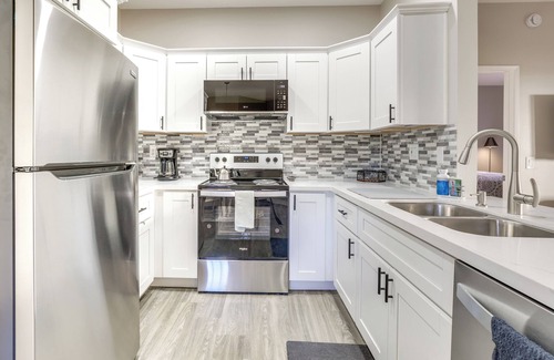 KITCHEN: Stainless steel appliances, blender, drip coffee maker, coffee/tea station, sugar, spices, oils, cooking utensils, dishware & flatware, dishwasher, microwave, toaster