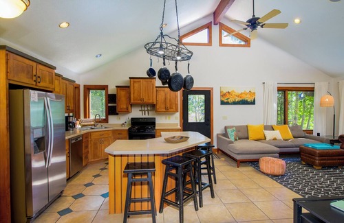 This recently remodeled 1500 sq ft. townhome provides flexible design with vaulted ceilings, dramatic windows and skylights to add a spacious feel. This open floor plan combines the dining room, living room and kitchen to create a comfortable and cozy place to gather. Smart TV, Free Wifi, and plenty of working spaces.