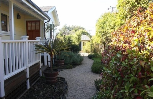 The property is mostly hidden from view by a rose covered fence. Each side of the Cape Cod style house offers a unique outdoor experience. The back deck gets wonderful, warm sun during the day. A nice large hot tub is perfect for relaxing after a long hike, ride or surf, or for stargazing at night. The outdoor fire pit is around the corner and looks out on a newly planted pollinator garden surrounded by bushes and trees. The front porch has an Adirondack loveseat for enjoying the evening light on Mt. Tamalpais.