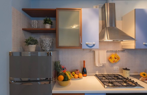 The entrance leads to the sunny living room, composed by a fully equipped kitchen and a living area with a table for 4/6 people, a comfortable sofa, flat screen Smart TV Sony 32” and DVD Blue-Ray player.