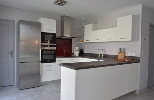 The villa features a fenced, furnished garden ideal for sunbathing, outdoor dining, and games. A fully equipped kitchen, barbecue, boules court, and lounge set make it easy to unwind and entertain. Inside, you'll find air conditioning, spacious living areas, and secure garage parking—everything needed for a comfortable stay.