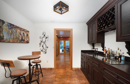 Step inside to find cherry hardwood floors, arched doorways, cathedral ceiling fans, an inviting stone fireplace with wood stove and a sitting hearth. The spacious primary bedroom with king bed leads directly to the outside deck for easy spa access. The luxurious bathroom has marble tile and on-demand hot water. The home also features a gourmet kitchen with stainless steel appliances and a cozy bar area with a bistro table.