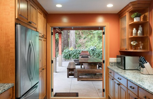 Located on a private, sun-drenched 1.3-acre lot surrounded by majestic redwoods, this 1,400 sq ft home provides amazing views from every room, beautiful vaulted wood ceilings, and high-end finishes. Enjoy the wonderful outdoor living spaces with hot tub, wrap around deck, lounge areas, BBQ, and large covered outdoor dining area. Located in the heart of Russian River Valley wine country, the home is a short drive to many renowned wineries, and the Russian River.
