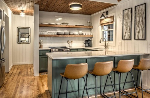 Kitchen - fully equipped main level kitchen, stainless steel appliances, electric stove, oven, custom cabinets, upper storage shelving, granite countertops, breakfast bar seats 4, kitchen utensils, microwave, crockpot, bar cart, Keurig Duo (bring basket filters),