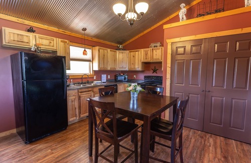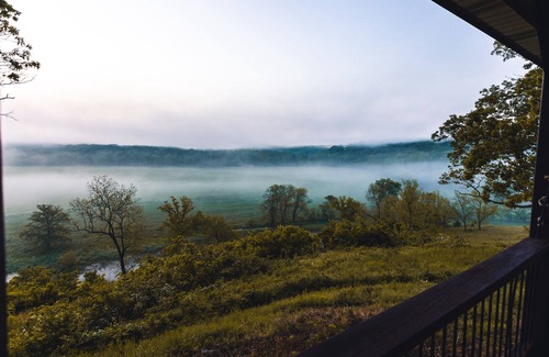 The Sunrise Cabin is fully furnished with 2 queen beds, all kitchen utensils, appliances, and linens. A full-sized washer and dryer and a dishwasher provide guests with all the comforts of home. All you need to bring are groceries, and if you would like to use the BBQ grill, charcoal and lighter fluid. The interior of the cabin is designed to make guests feel relaxed and comfortable. From the back deck, you can enjoy the astonishing views of the rolling hills, river, and fields below. The nearby pond holds some of the largest bullfrogs you will ever see and plenty of fish for you to catch. A picnic table, fire ring, and horseshoe pits are in the shade next to the cabin for guests to enjoy with family and friends.