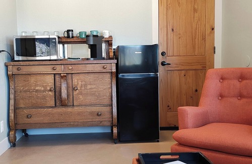 This cozy studio is a haven of tranquility, featuring a plush queen-sized bed with luxurious linens and soft pillows. The room is thoughtfully decorated to ensure a restful night's sleep, with calming colors and gentle lighting. A large window provides a stunning view of the granite walls towering above, allowing you to wake up to the beauty of nature each morning.