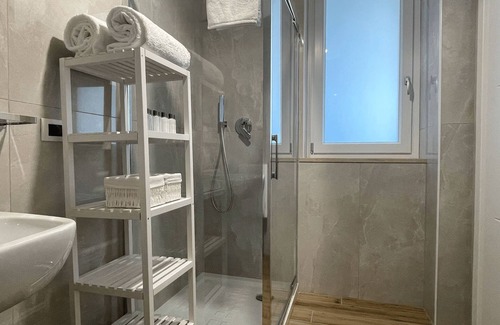 Il bagno, moderno e raffinato, è dotato di sanitari, una doccia spaziosa e un asciugacapelli Dyson accompagnato da un set di cortesia completo che include bagnoschiuma, shampoo, balsamo, crema corpo, saponette, cuffia, dischetti struccanti e cotton fioc.