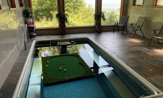 This amazing property is located on The Bluffs at Coffee Mill Golf Course in Wabasha, MN and can accommodate 10 people. This home has an indoor heated, endless spa that can be used year round and overlooks the Mississippi River. Or get cozy by the fire, and enjoy the sprawling views from the comfy couch in the sunroom. Make a family meal and dine together in one of the two dining rooms, or sit in the family room where you can throw some logs on the fire, watch movies, or enjoy the view from the massive picture window! During the summer months, head down under the bridge and listen to the band on Friday nights! Don't forget to stop by Slippery's Restaurant, where the famous movie "Grumpy Old Men" was filmed. The public boat landing is just 5 minutes from the property, so bring your boat and head on over to Lake Pepin, where water skiing was invented! Tie the boat off at The Pickle Factory and enjoy a meal! Don't have a boat? You can rent kayaks! If the River isn't for you, there is so much more to do! Visit the Eagle Center, Lark Toys, The Chocolate Escape, head over to the winery in Alma, play golf, rent bikes, and so much more to explore!