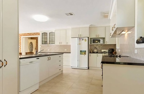 Kitchen: The large gourmet kitchen has everything you need to cook up a storm and includes a coffee machine, dishwasher and microwave to do all the hard work as well as a view of the beach in the distance. Inside a small cabinet in the kitchen is a TV that can be viewed from the kitchen bench for the early risers and cooks. There is a dining table here but to enjoy large family get togethers use the dining room which has a main dining table that is extendable. You might also prefer to sit on the extensive deck and fire up the barbecue and enjoy the view. There is a coffee pod machine and a percolator for filtered coffee.