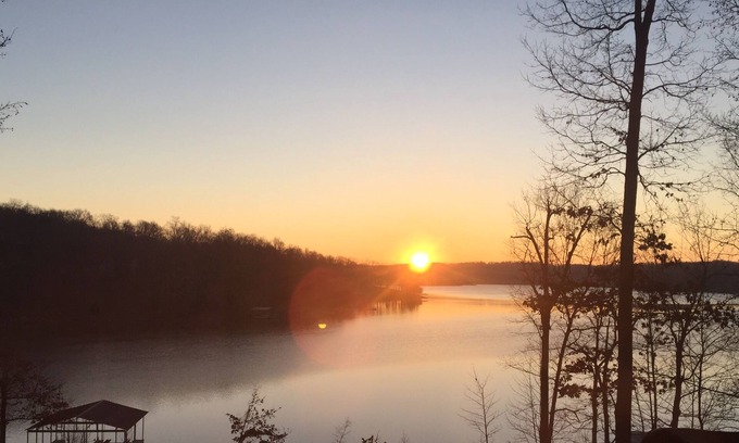 Nestled in remote Western Kentucky, on the banks of Lake Barkley and across from Land Between the Lakes National Recreation Area, is a luxurious yet rustic lake home known as Sunrise Serenity.