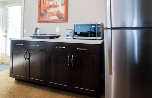 Upgrade the kitchenette is equipped with newly electrical appliances, such as electric hotplate, air fryer, refrigerator, microwave, toaster, Keurig coffee machine, kettle, cookware and utensils, easy to cook simple healthy meals.