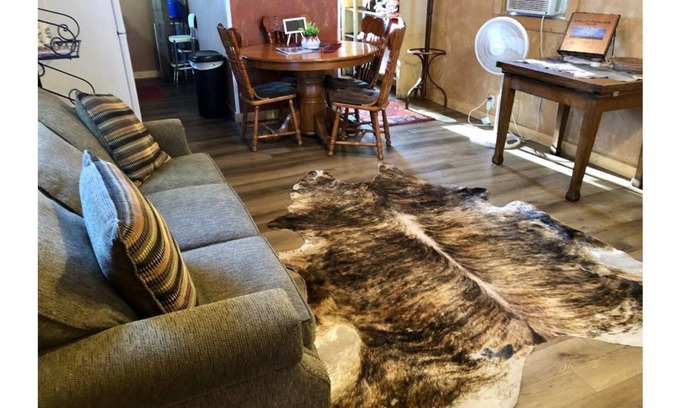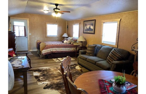 The cabin was built by a local craftsman in nearby Windsor, MO and is new to the property. Nestled next to the original home, which was constructed in the late 1800s, the cabin is decorated with a Southwest theme holding true to the owner's western roots. Enjoy this cozy and relaxing retreat while immersing yourself in the collection of books or magazines, games, or movies. Do some front porch-swingin', or take a walking tour of the farm. This Century Farm bodes a rich history and offers many remnants of the past. Owners Pam and Galen or a staff member would be happy to show you around and point out some of the interesting characteristics of this rustic paradise. There may even be a possibility of tagging along for morning or evening chores, so don't forget your boots!