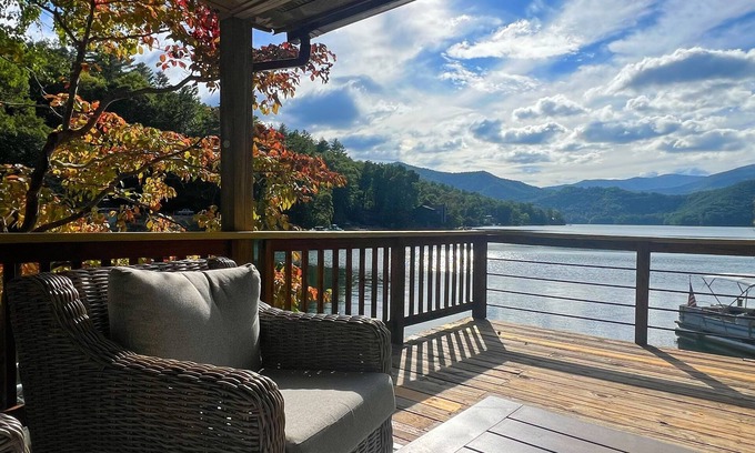 This delightful cabin on Lake Santeetlah offers stunning views and a large boat dock, ideal for enjoying the lake. There are two cozy bedrooms with a mix of sleeping arrangements, including king, queen, twin beds, sleeping up to six. A covered and furnished deck overlooks a fantastic view of the Nantahala mountains, one of the best on the lake. Explore nearby coves with two available kayaks, or swim and float right off the boat-ready dock. The cabin has AC, WiFi, Smart TV, a washer/dryer and parking for two cars. Explore nearby hiking trails, waterfalls, and great local food and music, in one of North Carolina's most pristine areas.