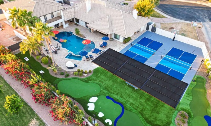 Enjoy the heart of Arizona at this gorgeous retreat. This luxury compound boasts 7 bedrooms, 7 full ensuite bathrooms. Between the indoor AND outdoor putting greens, unmatched indoor golf simulator/practice facility, double pickle ball courts, resort pool, 3 Xbox stations, ultimate sports lounge, billiards, arcade games all for an extraordinary stay. This home has everything! It is located in a beautiful, quiet neighborhood within 20 min of Skyharbor airport and Oldtown Scottsdale.