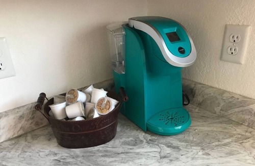 Two bedrooms each feature a queen-size bed. Additional sleeping space is available on a sofa and futon in the living room. The house can accommodate six guests total.