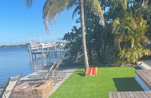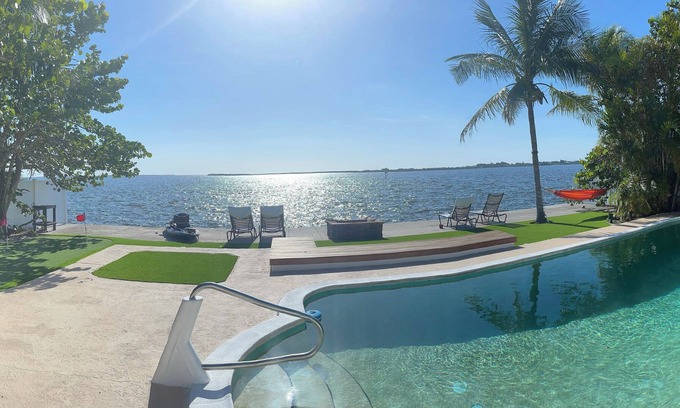 AMAZING, SUNSET VIEWS. Home faces due west to LARGE OPEN WATER and is not on a canal like other homes so you have COMPLETE PRIVACY and aren't looking at houses across the way. Take a dip in the NEWLY HEATED, LIGHTED AND RESURFACED POOL, while your fishing rods are in the water. Enjoy family fun on the NEW PUTTING GREEN OR LAY IN THE HAMMOCK AND WATCH DOLPHINS. New GOURMET KITCHEN AND ISLANDS INSIDE AND OUT. WATCH THE SUNSET OR ROAST MARSMALLOWS AT THE FIRE PIT. Have a relaxing holiday on this lovely oasis on the water. YOU WON'T WANT TO LEAVE!!!