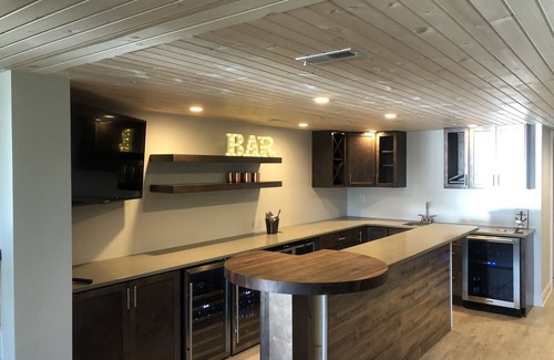 With full lakehouse decor, enjoy a relaxing coastal feel while in the Midwest at this Bass Lake Retreat. The main floor has an open kitchen concept with lake views from almost every room. The great room is cozy with an electric fireplace and a vaulted ceiling. Lots of windows allowing for natural light, lake views and GORGEOUS PINK sunsets! The main floor has a master bedroom and queen bedroom, sharing a master bath. Enjoy a master bath with a rain shower after a long day of sun and swimming. The upstairs loft is perfect for adults or children with a lake view, nautical decor, a TV, window seats and plenty of play room. The walkout basement has lake views from the moment you walk downstairs. The basement is complete with full view of the lake, a second living area/game room, a laundry room and best of all - a full basement bar with 50" tv, 12 foot long bar with 5 beer/wine fridges all with lake views!