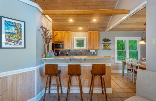 The kitchen is well stocked with dishes, utensils, and all the essential cooking items you’ll need; and a gas grill is also available for use. The dining area is large enough for eight people, with three bar stools for additional seating. The home has a gas log fireplace in the living room, and a fire pit outside for the best of both worlds. A hot tub that is regularly maintained and cleaned is on the downstairs patio.