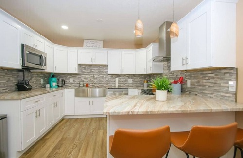 Your stay at Sunset, Paradise Escape includes exceptional amenities designed to ensure a seamless experience. Each of the five bedrooms provides privacy and comfort, accommodating up to 10 guests. Enjoy modern conveniences such as a fully equipped kitchen, high-speed internet, and smart TVs. The expansive backyard, adorned with cozy seating and charming patio lighting, is perfect for outdoor ceremonies and receptions. Plus, you can unwind in the game room after a long day of wedding festivities, ensuring laughter and fun with family and friends.