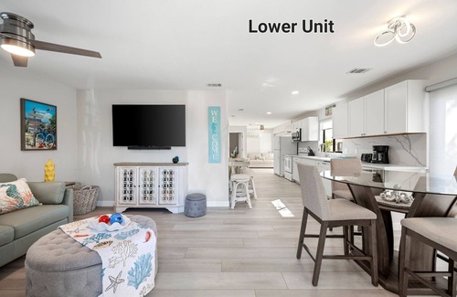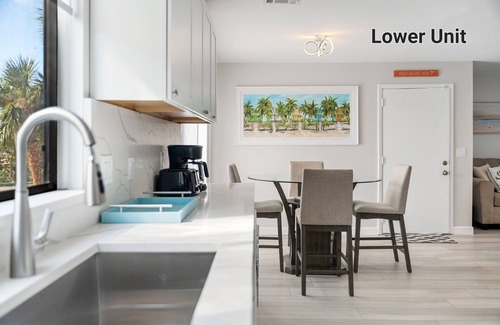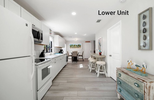Sunset Rendezvous Beach has been thoughtfully renovated and elegantly designed, seamlessly blending modern beach aesthetics with a touch of Old Florida flair. The kitchen features sleek stainless steel appliances and is fully stocked to meet all your culinary needs. The master suites each boast a brand-new Queen bed, ample closet space, and a dresser, offering a peaceful retreat where you can truly unwind. The second bedrooms, equally inviting, each furnished with two new twin beds, a closet, and a dresser—ideal for additional guests.