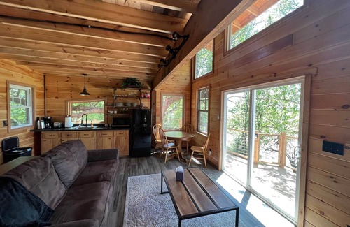 Perched high among the trees, the Sunset Reset Treehouse is just steps from a spring-fed creek and offers total peace and quiet. The wraparound deck gives you panoramic views of the serene landscape, where you can unwind and soak in the beauty of the natural world.