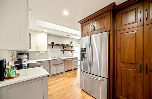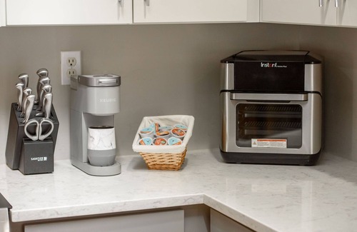 The kitchen is equipped with updated appliances, a Keurig, air fryer/toaster oven, new pots and pans, and standard tools/cooking utensils. There is also a full-sized bath, and a washer and dryer.