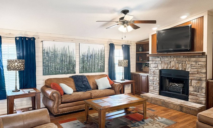 Escape to Sunset Ridge, a beautiful 3-bedroom, 4-bath cabin in the heart of Cobden, IL. Ideal for larger families or groups seeking both privacy and shared memories, this cabin offers two luxurious king bedrooms and an additional bedroom with two twin beds. Prepare meals in the modern kitchen, gather around the fireplace, or step out onto the large deck to savor spectacular sunset views. Enjoy conveniences including air conditioning, central heating, complimentary Wi-Fi, and all the amenities to make your stay unforgettable in the Shawnee Hills region.