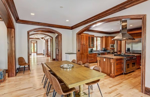 The expansive chef's kitchen, with Dacor range, second wall oven, warming drawer, wine cooler and blue stone slab countertops, is fully equipped to handle any occasion. The main island has seating for four for friends or family to spend time together while cooking a gourmet meal. The kitchen is fully stocked for all your entertaining needs with plenty of storage in the cabinets to feed your whole crew. The kitchen has a pass through window to the elegant indoor/outdoor dining room.