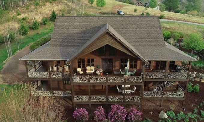 Luxury and Long-Range Mountain Views in Franklin NC. This amazing custom home has everything for your vacation. Great Views, location, easy access and paved to the door. This home has a large attached 3 Car carport with room for a few more cars if needed in the additional uncovered parking area. The home is 5-bedroom home with 6 baths with tile showers (his and hers bath with jacuzzi bath tub in the main master)! Two wonderful relaxing decks accent this beautiful home, both with great views and plenty of space for a family get together! In the interior has vaulted T&G ceilings, granite counter tops, amazing engineered wood flooring, stainless appliances (double ovens for the holiday get togethers) and lp gas tankless water heater. You'll enjoy a spacious breakfast bar, Stone Rock Fireplace (gas logs available in the winter months). 4 King Masters on the Main level. Lower level has a large Media Room or Family Gathering Room, a stacked rock gas log fireplace (available in winter months only), and a bedroom room with full bath. The lower level also has another terrace with a great view!Also has a backup generator!