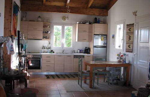 Charming, two level, house high up in the lush, green area of Kokkini, just outside Marmari, with a long beach stretching , 2.5 klms below. House overlooking the bay, offers stunning sunset views and privacy in a beautiful, large, Mediterranean garden. Main floor is an open space design with living room, kitchen-dining room area and a two step-up bedroom, with two single beds, bathroom and separate W.C. Futon couch opens up to an extra double bed. Walk out to patio and garden and down some steps, you will find a separate, private furnished accommodation with double bed, dining table etc, breakfast facilities and small fridge, shower and W.C. It also enjoys its own patio onto the garden.