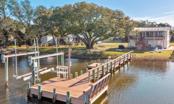 Escape to the serene and picturesque beauty of Eastern North Carolina at this lovely riverfront property! The private dock allows for easy access to the river, while the back yard provides fun outdoor entertainment opportunities with yard games and a hammock under the shade of a magnificent southern live oak. If the weather is not cooperating, don't worry, stay in and play a round of foosball or air hockey. The views of the river offer amazing sunsets and glimpses of the local wildlife - even dolphins! Bring your fishing rod and catch flounder and red drum off the dock (during high tide in summer and fall months) or use the provided crab pots to catch blue/stone crabs. Our Kayaks are free to use - have fun exploring the river and nearby sound! This is the perfect spot for your next family vacation or fishing trip!