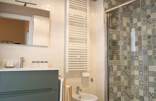 Il bagno, moderno e raffinato, è dotato di sanitari, una doccia spaziosa e un asciugacapelli Dyson accompagnato da un set di cortesia completo che include bagnoschiuma, shampoo, balsamo, crema corpo, saponette, cuffia, dischetti struccanti e cotton fioc.
