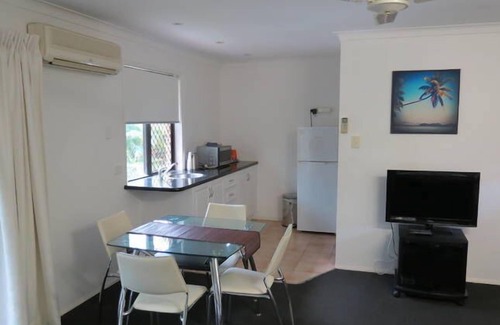 This room looks on to the timber deck, pool and water views. Plasma TV, air conditioning and ceiling fan.