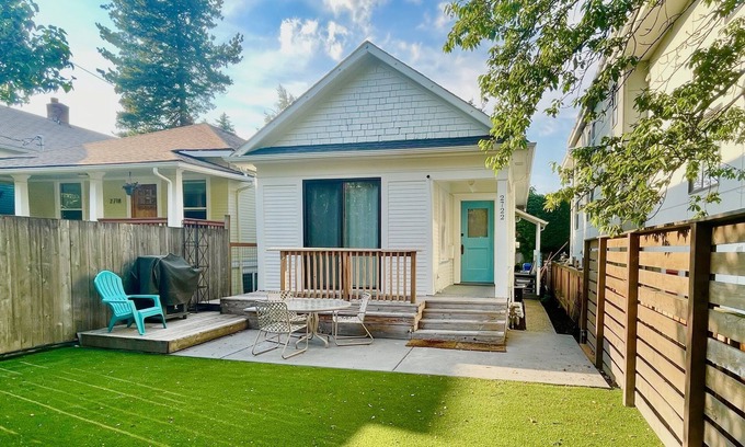 Settle into the old world 1904 charm, featuring tall ceilings, hardwood flooring and a recently remodeled bathroom. Front of the home features a large deck, small fenced yard and patio equipped with a BBQ. A larger sliding glass door connects the deck to the main living area which features an Italian leather couch, wall mounted 70" 4k Smart TV, coffee table and extra seating. Dining room features a breakfast nook and seating for 4. Kitchen features a gas range, full size refrigerator, Keurig coffee maker, dishwasher as well as pots, pans, bowls, knives and other essential cooking utensils.