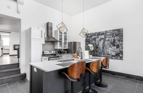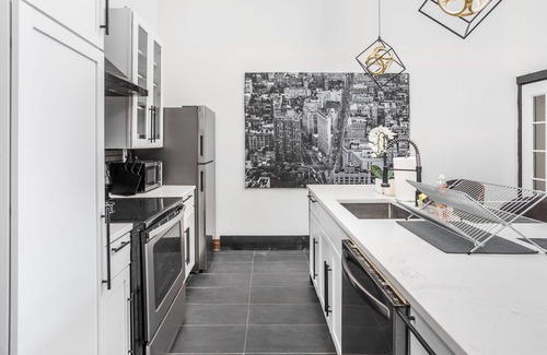 Welcome to a chic and trendy escape at this downtown penthouse. Sleeping 2 in a one bedroom (queen size bed) and one bath ensuite, this space is ideal for a couples retreat, business trip, or just traveling through the chill, slow paced city. Feel at home away from home in a contemporary style interior, with accents of unique art decor, light fixtures, and furniture. If needed, set up a personal work space right from the bedroom with a desk for added privacy, or at the large dining room area, where a serene view of downtown can be seen. Walk into the open living space for a relaxing ambiance, including a flat screen TV (in the bedroom as well), retro furniture and extra seating for guests. Have guests over and dine in with a fully stocked, pristine kitchen, included with bar stools, and the essential items, like a coffee maker, dish-washer, microwave and even more. Convenience is as prominent as its style, with an in-house washer and dryer, hi-speed wifi/internet, fresh linens, towels, as well as soap/shampoos.