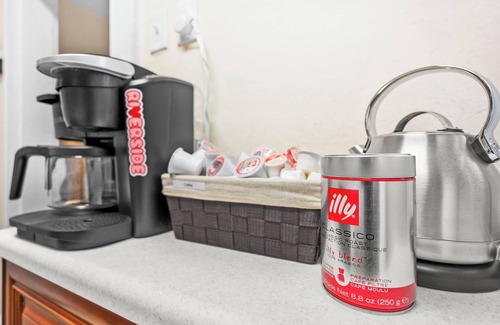 The kitchen is full of snacks, sodas, a bottle of wine for you, and spices/oils/etc for cooking. The kitchen has pots, pans, microwave, etc, and an Illy coffee maker with more coffee and espresso pods than you'll ever be able to drink. There's also an Aeropress with ground Illy coffee.