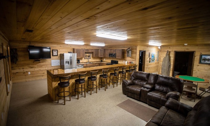 This lodge was built in 2017 and serves as an awesome place to have a small or large group of people come for a visit or have an extended stay. The entire interior of the lodge is all cypress walls and cypress ceilings. There are 3 bedrooms in the lodge. Each Bedroom has 2 sets of Full/Full bunks. All mattresses are made of high-quality memory foam. The Main Room has a large open kitchen layout complete with a refrigerator, stove/oven, microwave, dishwasher, toaster, and coffee pot. There are tile countertops in the kitchen as well as a custom-built 18ft bar with 8 cushioned high-top barstools. There is also 1 couch, 1 love seat, and a card table in the main room. There are 2 full bathrooms both with walk-in tile showers. The entire property outside is freshly paved asphalt and there is plenty of room for vehicles as well as vehicles that are towing boats. There is enough room to stay hooked up to your boat while you stay at the lodge. There is a covered front porch and a charcoal grill.