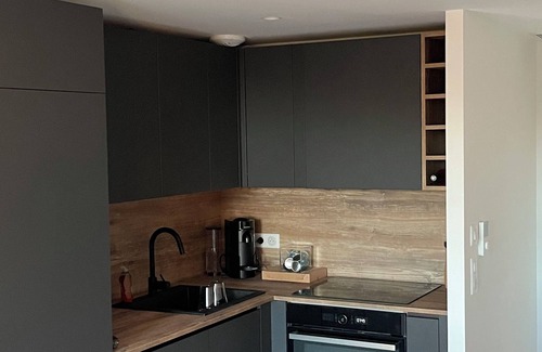 The apartment is situated in a newly constructed, high-end residence that boosts spectacular ocean views. The apartment includes a private terrasse (15 m2) for outdoor dining or lounging. The interior of the unit is fully equipped with all modern comforts, including a queen size bed, fully fitted kitchen (refrigerator, freezer, dishwasher, Nespresso machine, kettle, induction stove top and oven), washing machine, central A/C, window shutters, high speed internet, and cable TV. The unit has a separate WC from the shower room to ease access for all guests. Upon request, the unit can accommodate up to 4 guests as the sofa includes a premium, high quality queen size bed.
