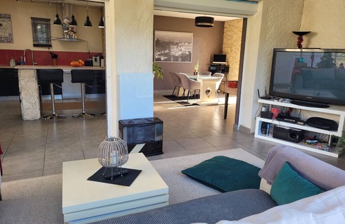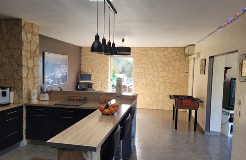 Our house is exposed South / South-East without any opposite. All our rooms overlook the garden directly. Our living room / kitchen opens onto two large terraces (one of 30m ^ 2 with a view of the Nice hills; the other of 25m ^ 2 equipped with a bar, with fridge, worktop, BBQ, pizza oven, itself topped by a large garden furniture on 30m ^ 2). We can thus enjoy the summer season around the pool in peace, with our children, without necessarily having to go to the beach, which is still 15 minutes away.