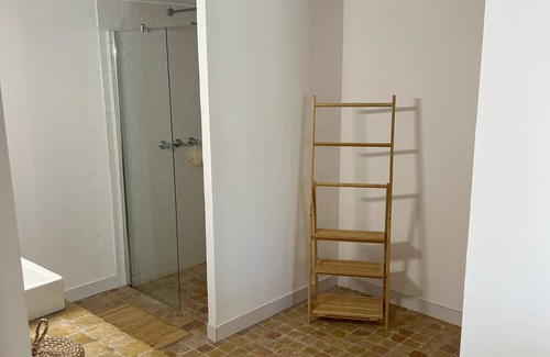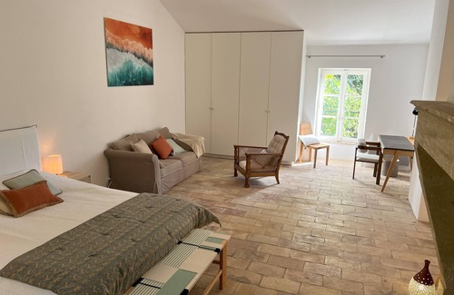 Separate from the rest of the farmhouse, a lovely 40 m² suite with its own private access on the north side and a small terrace. Private bathroom and toilet.
