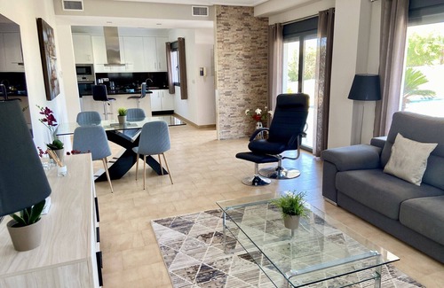 Local Restaurants, bars shops major supermarket etc. all less than 10 minutes walk, Local park only 5 minutes walk with football and basketball pitches, ping pong tables, children´s play area , exercise park, picnic area and green zones . A car is recommended as you will need it for the Beach, (nearest beach is a 7 minute drive) if you don't have a car there is a good local taxi & bus service in the Los Balcones area . A Stylish modern villa in a great setting ideal for a family holiday .