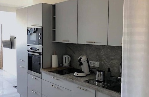 Fully equipped kitchen with dishwasher, hob, oven, microwave, coffee capsule machine, kettle, toaster.