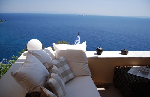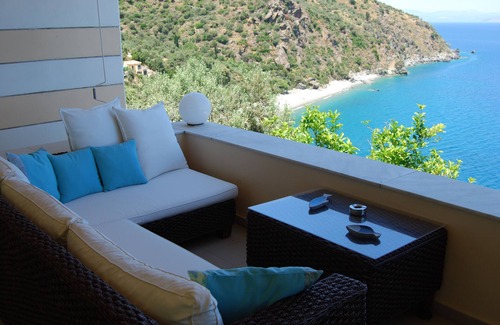 Our house is new built with excellent sea view ,only five minutes walk to our almost private beach from a path starting from our terrace.