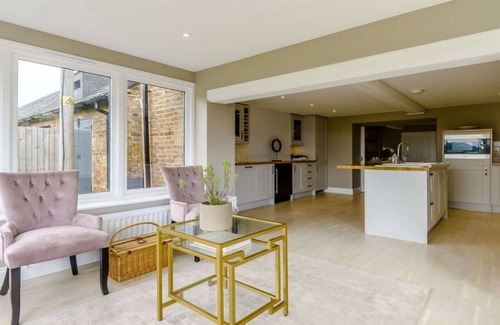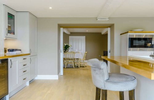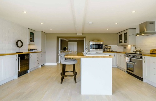 A superb, well-equipped kitchen, island bench with two bar stools, fridge/freezer, wine fridge, electric Rangemaster oven and hob, dishwasher, Sage barista coffee machine, Nespresso coffee machine (some pods provided), microwave, kettle and toaster