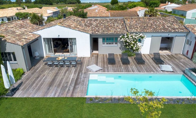 In the heart of the village of Loix, on Rue du Moulin, just steps from shops and the beach, this family home of 280m² sits on a 1,000m² plot. It features 6 double bedrooms, accommodating a total of 12 guests, each with its own en-suite bathroom and WC. The house is divided into two facing sections, making it an ideal setup for family stays with older children or for hosting friends. Bathed in natural light all day long, its large windows open onto the garden and pool, creating an idyllic atmosphere to enjoy every moment in absolute tranquility. This architect-designed house offers the highest level of comfort, thoughtfully designed in every detail for ultimate relaxation.