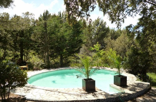 very original architect's house built in 1977 with large cathedral living room, stone walls, leather lounge, beautiful furniture, 4 bedrooms including a 'studio' with shower room, veranda, linen room, laundry room, internet, breathtaking view 40 km away round with the Palais des Papes in the middle (Avignon at 10km), 1 hectare of garden with no neighbors, 3 terraces, round swimming pool 7m in diameter, 1m60 deep, well protected by a discreet fence (hidden in the vegetation ) and 3 small gates leading to the garden, hammocks, deckchairs, several garden tables to choose your space ... for rent by the fortnight, in summer