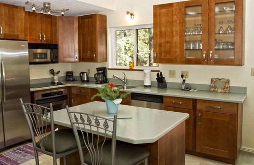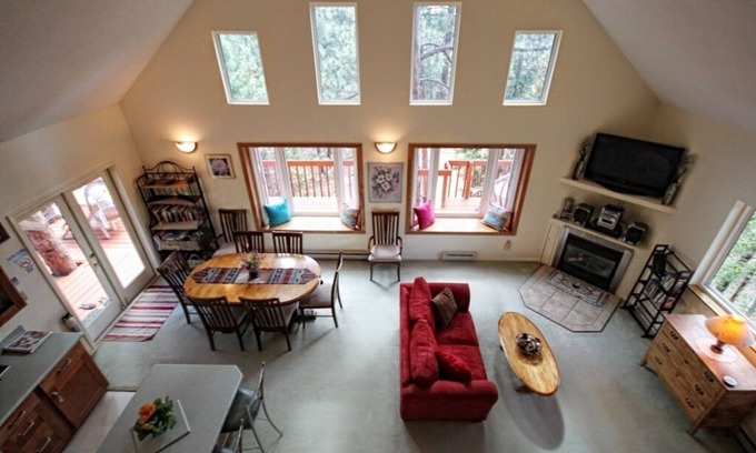 The Great Room has a vaulted beamed ceiling with French doors straight out to the spacious, wrap-around deck to view the distant and often snow-capped mountains. Pine trees weave their way through the deck and, in different seasons, you can watch the brilliant blue Stellar Jays and tiny hummingbirds feed. Or enjoy the Mule Deer as you dine either inside or al fresco on the deck.